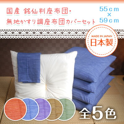国産 出来立て銘仙判座布団・かすり調無地座布団カバーセット 55cm×59cm【しっかりパンパンに綿入れ】【コットン100% 綿100%カバー】【1枚から発送】【カバー丸洗いOK】【厚手しっかり生地】【カバーセット】